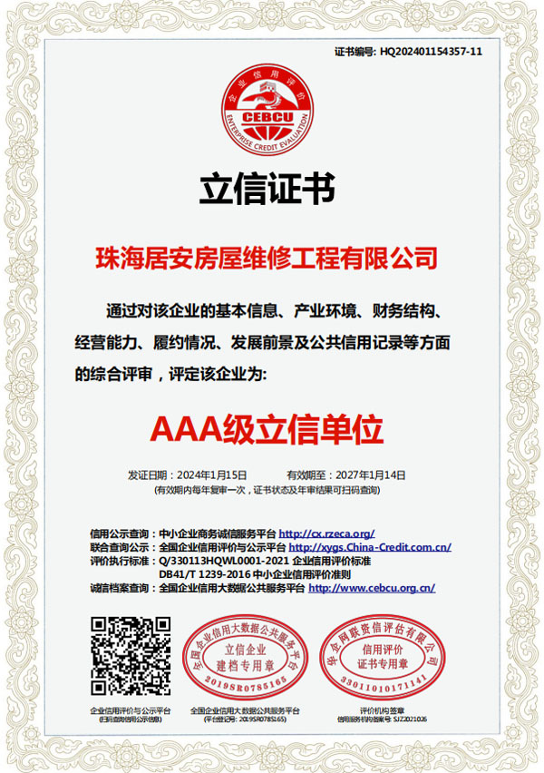 珠海居安房屋維修工程有限公司成立于2020年,是一家專注房屋維修的公司。我們擁有各類型專業(yè)人才,業(yè)務(wù)包括老舊建筑翻新改造、外墻空鼓修復(fù)、防水幕墻養(yǎng)護(hù)、外墻預(yù)置構(gòu)件拆除更換、供排水管網(wǎng)改造、墻面翻新、鋼制結(jié)構(gòu)建筑構(gòu)建及折除,外墻清洗及裝修裝飾。